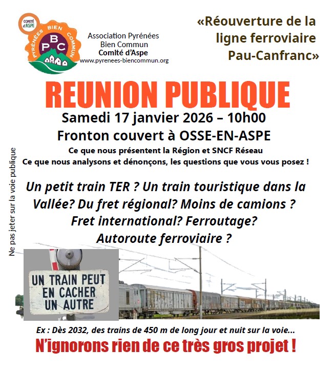 PYRENEES BIEN COMMUN (PBC) poursuit son travail d’information et d’analyse du projet de réouverture de la ligne « Pau-Canfranc » auprès des populations des territoires, sur Pau Agglomération, le piémont Oloronais et la Vallée d’Aspe.